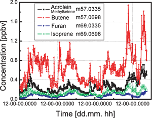 イソプレンと主として燃焼由来のフランが、整数質量数67でブテンとアクロレイン(及び一部のメチルケテンを含む)が精密質量数で分離でき、
